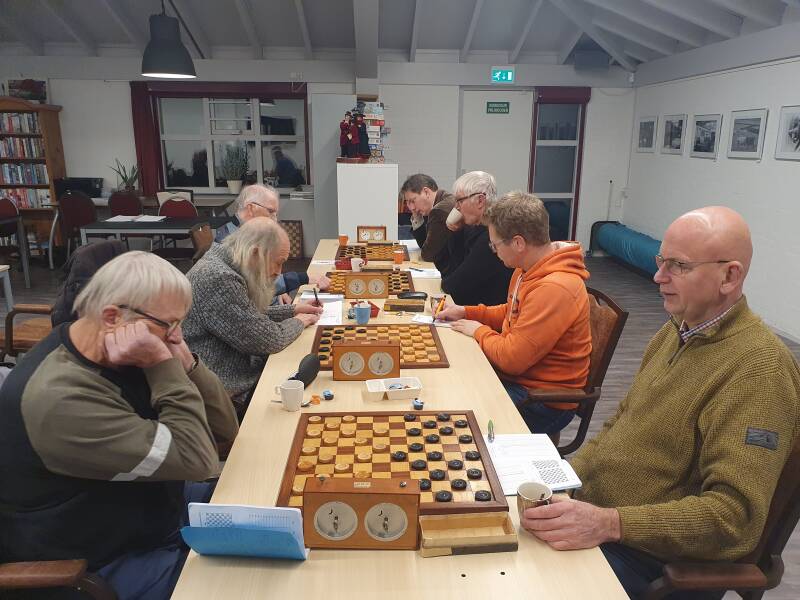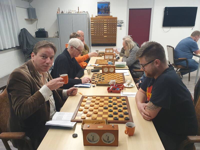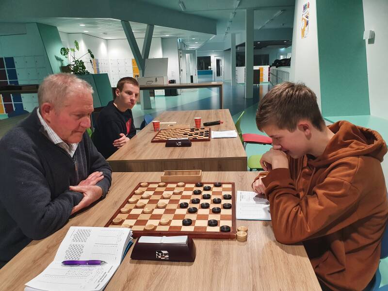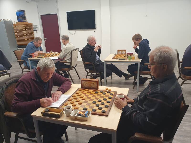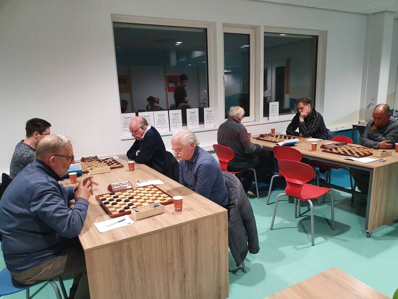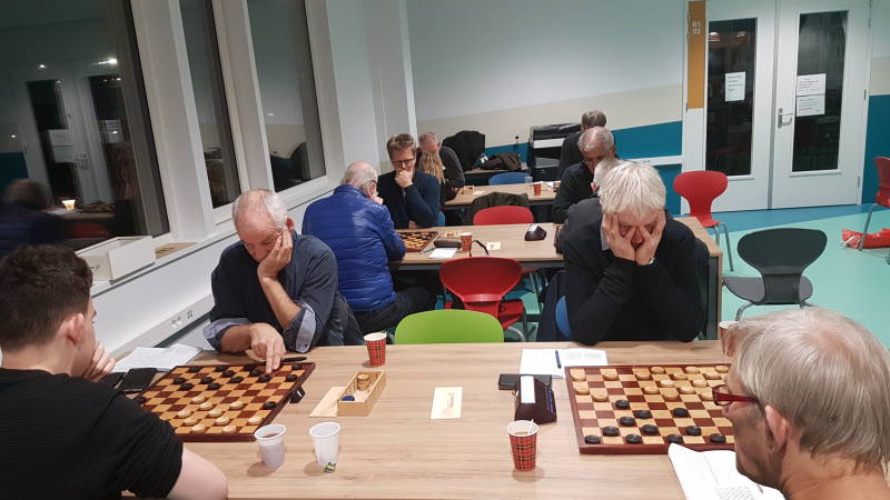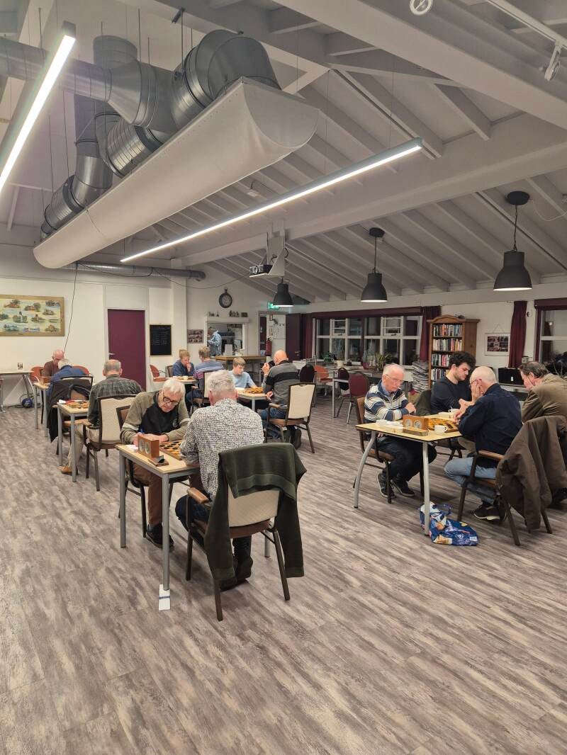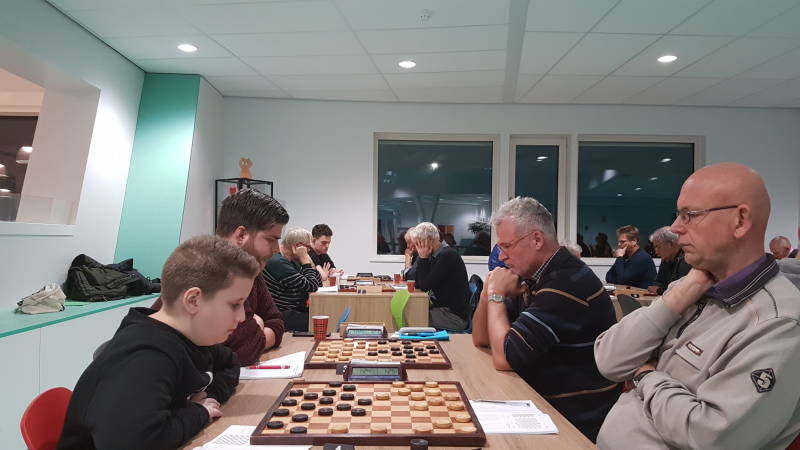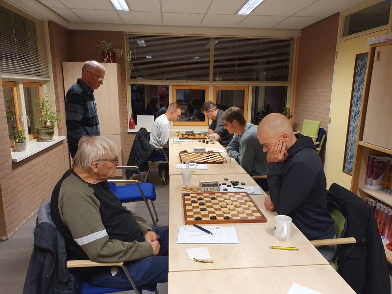 Sierd speelde een puike partij tegen Thomas van der Klis die hij met een fraai eindspel bekroonde! Luca won ook mooi met een prachtige afwikkeling forceerde hij schijf en partijwinst! Luuk speelde zijn tegenstander keurig weg in een dun standje! Bert van Leijden speelde een puike partij maar vergat het af te maken. Bertus maakte ook gehakt van zijn tegenstander Bert kreeg het hele centrum en wist dat mooi uit te buiten! Frans Groot speelde ook goed maar maakte een blunder en verloor helaas. Adri speelde een prachtige flankspel partij waarin Adri duidelijk liet zien wie er het meeste van af wist winst dus voor Adri! Ivar speelde ook goed! maar kwam helaas net te kort en verloor de partij. ik zelf speelde tegen de zwaarste man van het gezelschap ik dacht iets in het voordeel te komen maar bij analyse was het allemaal gelijkwaardig.