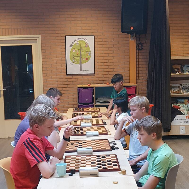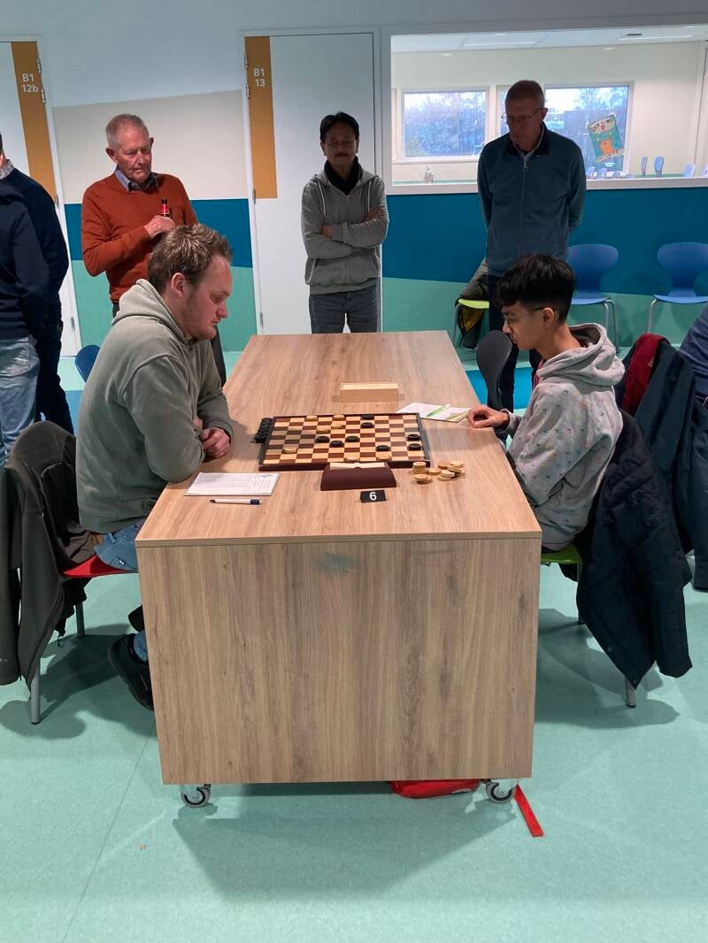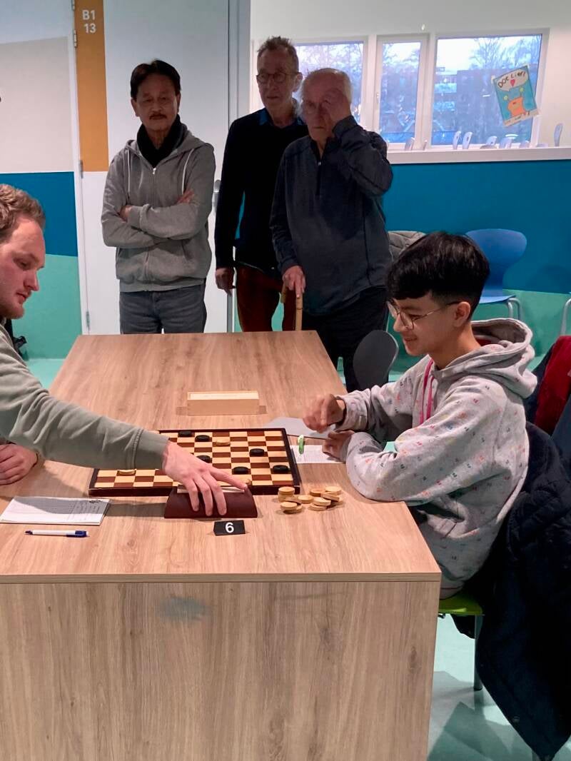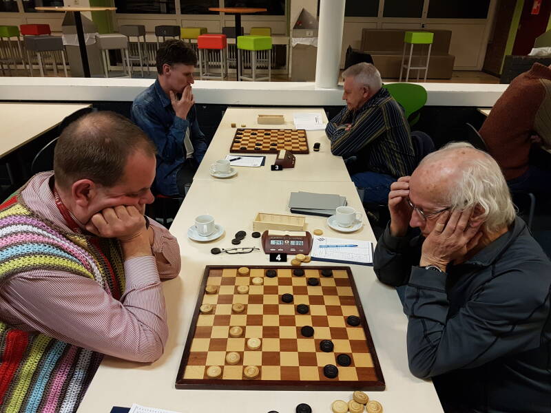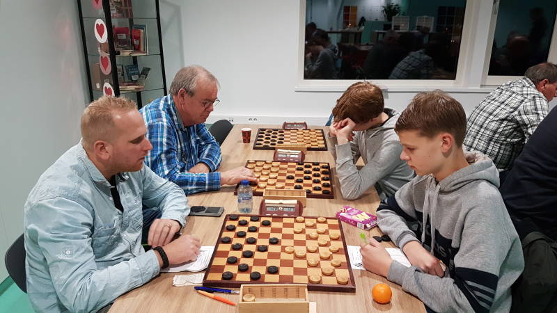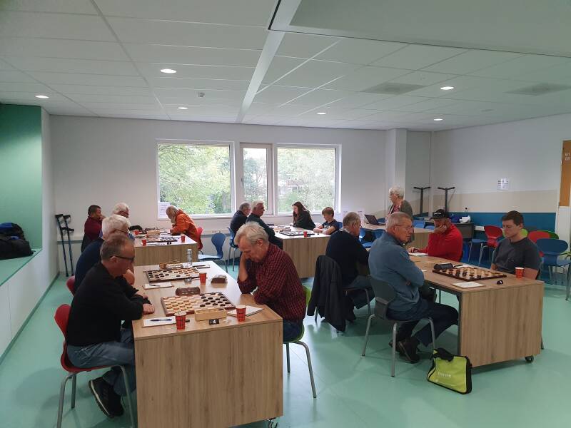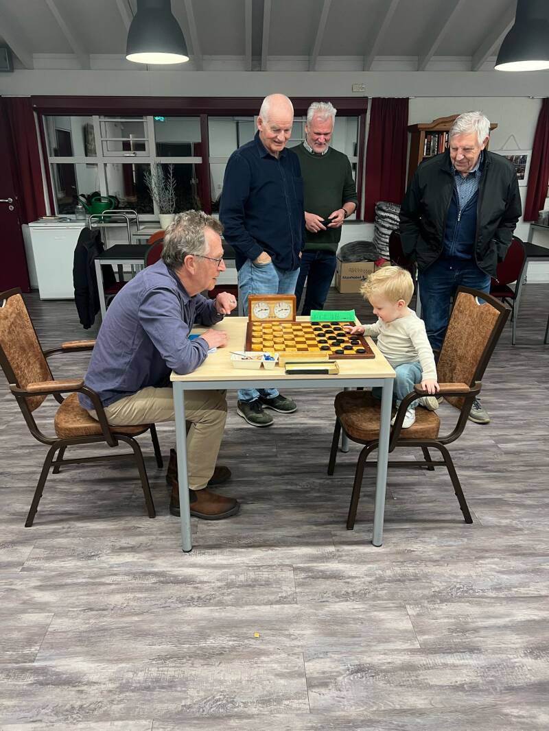 Sierd speelde een puike partij tegen Thomas van der Klis die hij met een fraai eindspel bekroonde! Luca won ook mooi met een prachtige afwikkeling forceerde hij schijf en partijwinst! Luuk speelde zijn tegenstander keurig weg in een dun standje! Bert van Leijden speelde een puike partij maar vergat het af te maken. Bertus maakte ook gehakt van zijn tegenstander Bert kreeg het hele centrum en wist dat mooi uit te buiten! Frans Groot speelde ook goed maar maakte een blunder en verloor helaas. Adri speelde een prachtige flankspel partij waarin Adri duidelijk liet zien wie er het meeste van af wist winst dus voor Adri! Ivar speelde ook goed! maar kwam helaas net te kort en verloor de partij. ik zelf speelde tegen de zwaarste man van het gezelschap ik dacht iets in het voordeel te komen maar bij analyse was het allemaal gelijkwaardig.